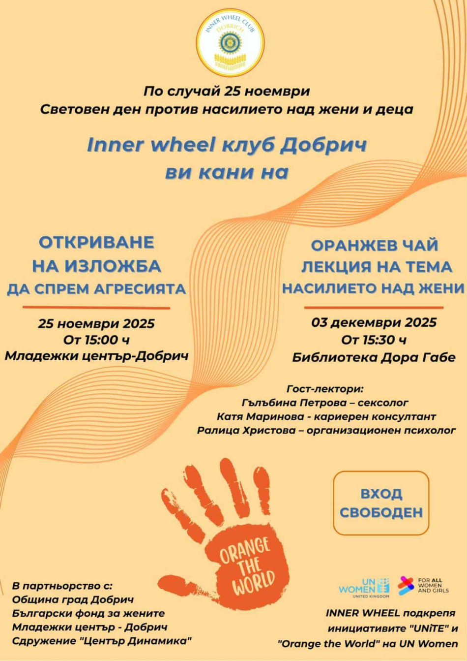 Inner Wheel клуб Добрич организира две събития: откриване на изложбата „Да спрем агресията“ на 25 ноември 2025 г. от 15:00 ч. в Младежкия център – Добрич, както и „Оранжев чай“ с лекция на тема насилието над жени, която ще се проведе на 3 декември 2025 г. от 15:30 ч. в библиотека „Дора Габе“. Гост-лектори ще бъдат Гълъбина Петрова (сексолог), Катя Маринова (кариерен консултант) и Ралица Христова (организационен психолог). Входът за събитията е свободен.