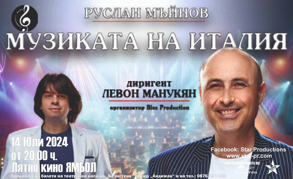 На 14 май от 19:00 ч. в зала „Добрич“ (органова зала) е концертът на Руслан Мъйнов - "С музиката на Италия", заедно със Симфониета Видин.