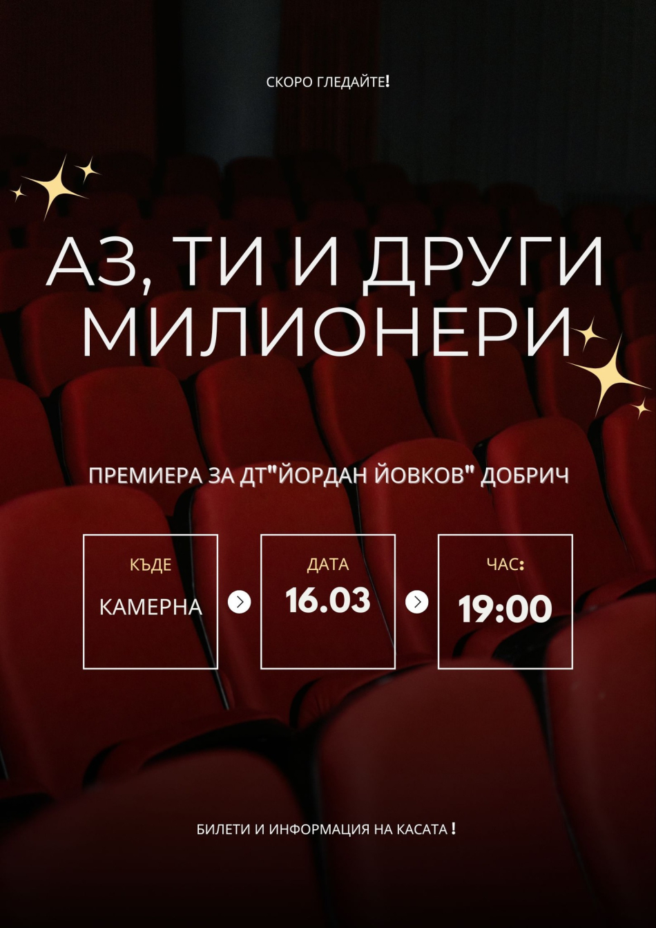 Очаквана премиера на сцената на добричкият театър дни преди Световния ден на театъра. „Аз, ти и други милионери“ идва на сцена в Драматичен театър „Йордан Йовков“. От този понеделник билетите вече са в продажба, на касата на театъра. Премиерата е на 16 март от 19.00 часа в Камерна зала.