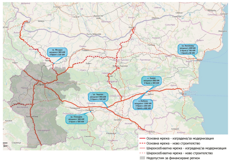 Новите бързи зарядни станции ще бъдат изградени на автомагистрала „Тракия“ при изходите за Чирпан и за село Кабиле, на булевард Асеновградско шосе край Пловдив, на път Е-79 край Мездра, в местността „Чанлъка“ в Аксаково и в близост до село Завой, област Ямбол.