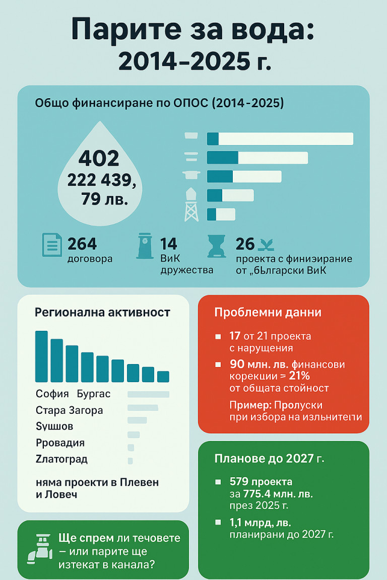 402 222 439,79 лв. са средствата, с които са финансирани проекти в сектор Води по Оперативна програма "Околна среда" за периода от 1 януари 2014 г. до 10 октомври 2025 г. Това показва справка на Министерството на регионалното развитие и благоустройството (МРРБ) за News.bg.