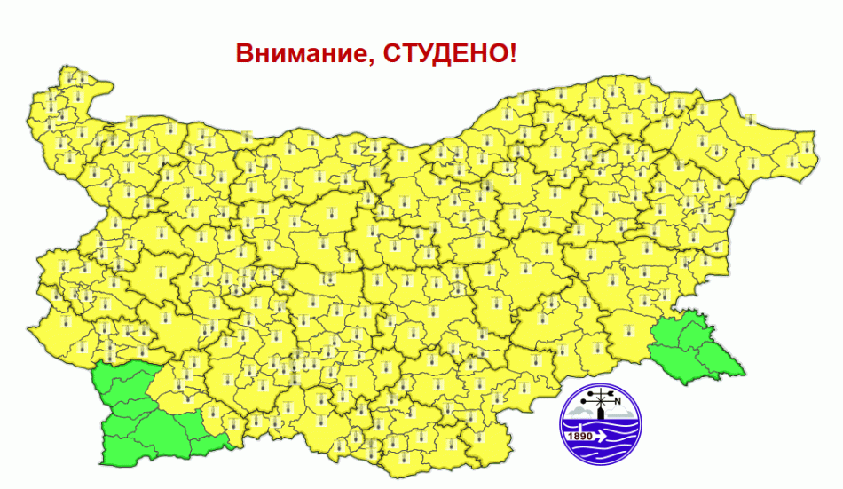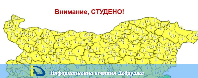 Втори пореден ден жълт код за много студено време в страната. По данни на Националния институт по метеорология и хидрология в Добрич тази сутрин минималната измерена температура е били минус 9,9 градуса. Стойностите са малко по-високи сравнение с измерените вчера сутринта минус 12 градуса.