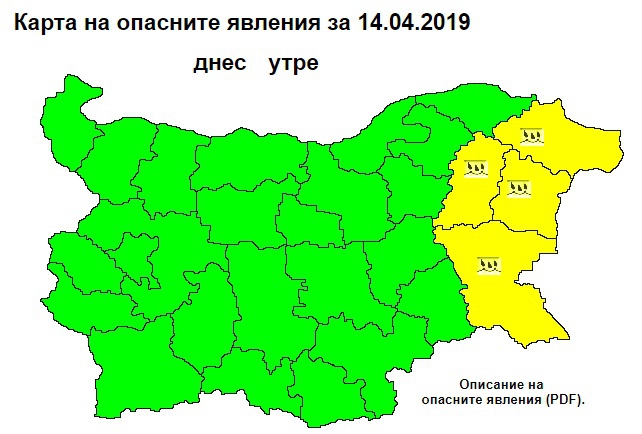 Днес в сила е жълт код за обилни валежи в Източна България. Областите, за които важи предупреждението са: Добрич, Варна, Шумен и Бургас. Според данните на Националния институт по метеорология и хидрология на места са възможни сумарни количества на валежите между 30 и 40 литра на кв. метър.