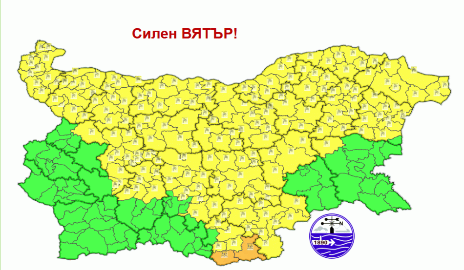 Ще бъде облачно, валежите ще продължат, като на места ще са значителни по количество и на изолирани места по фронта придружени с гръмотевици. С понижението на температурите в голяма част от страната дъждът ще премине в сняг и главно в Северна България и планинските райони ще се образува снежна покривка. Жълт код за потенциално опасно време и много силен вятър е в сила за почти цялата страна, с изключение на няколко области в Южна България.