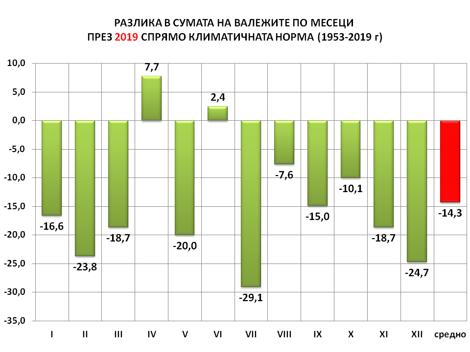 Фигура 1. Разлика в сумата на валежите по месеци през 2019 спрямо климатичната норма (1953-2019 г)