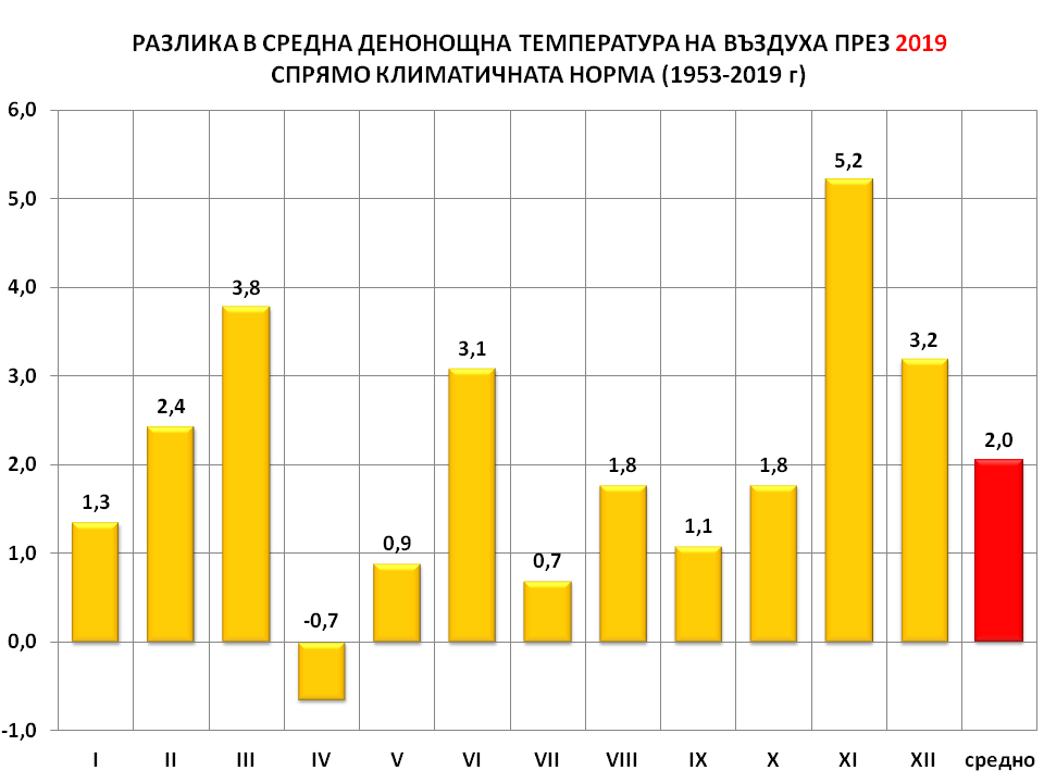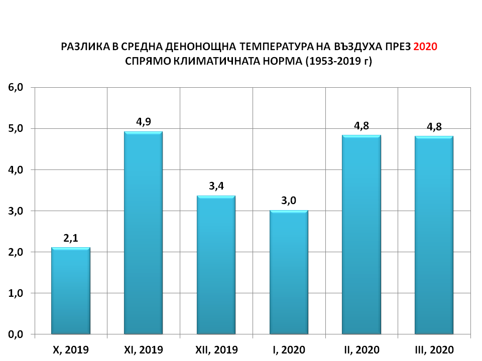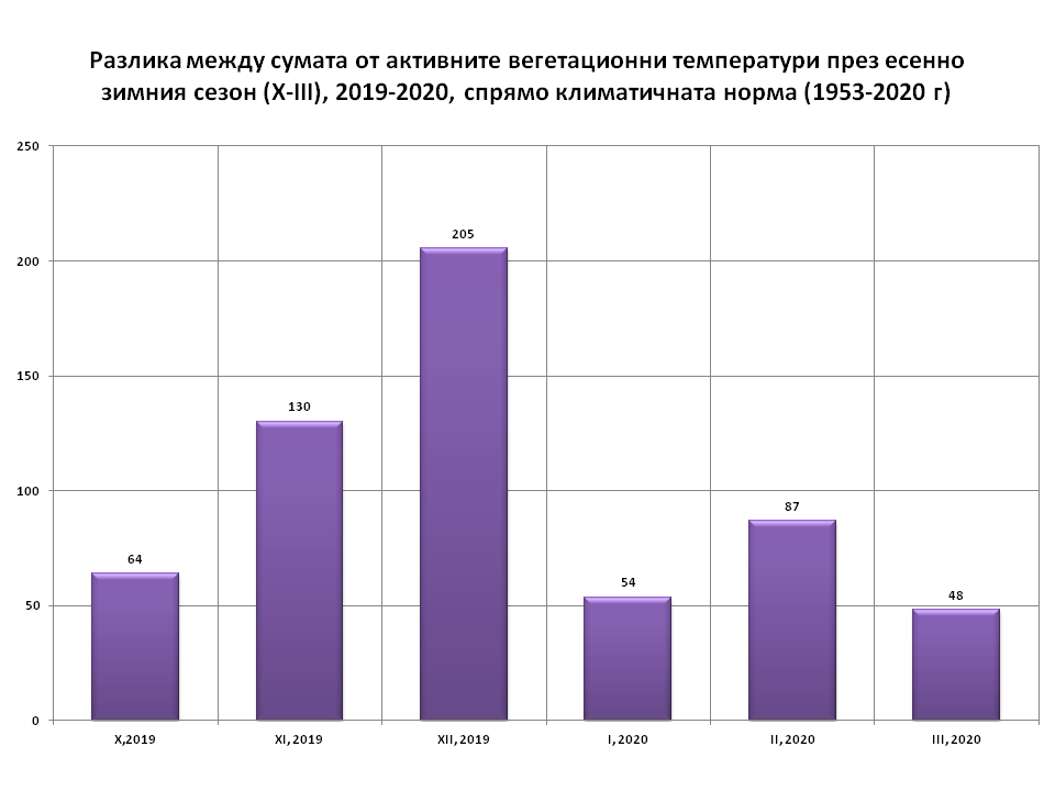 През есенните месеци на 2019 г. температурата на въздуха бе с около 3,5 градуса Целзий по-висока от нормалното. Тази тенденция продължи и през първите три месеца на 2020 г., в която средната денонощна температура достига до над 4 градуса Целзий повече обичайното за този период на годината. Особено високи са нивата на температурата през февруари и март (+ 4.8 градуса), което доведе до значителна загуба на количества влага от почвата следствие на изпарения от растенията. Високата температурата през светлата част на денонощието бе предпоставка за активна постоянна вегетация на есенниците през целия този период (фигура 5). През този 6-месечен период сумата от активните температури за вегетация е превишила климатичната норма с 511 градуса (+35 %).