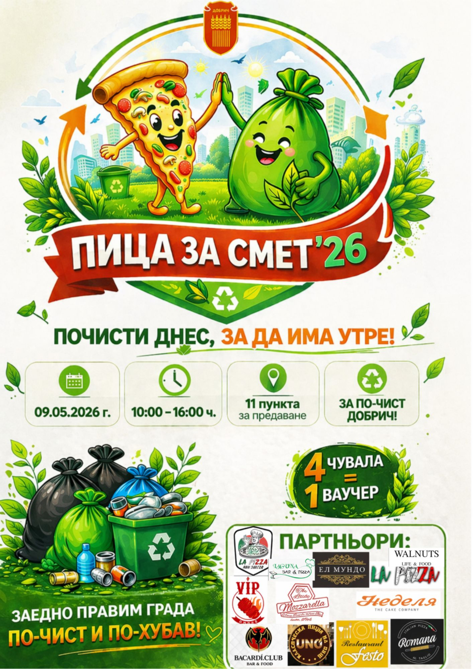 Община Добрич обяви третото издание на кампанията „Пица за смет“, която тази година ще се проведе на 9 май от 10:00 до 16:00 часа.