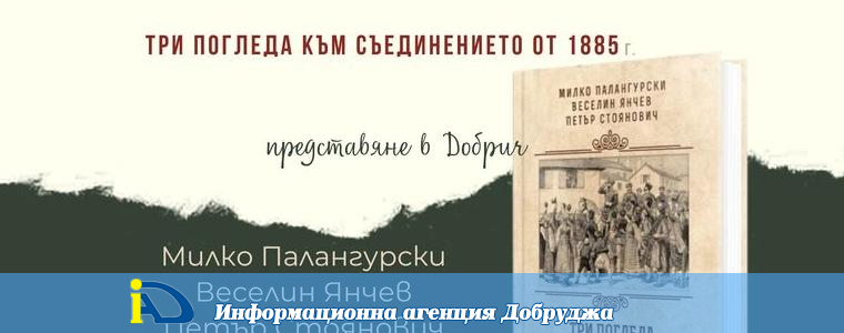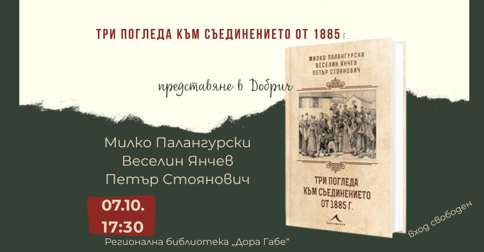 На 7 октомври /вторник/, от 17.30 ч. в Регионална библиотека „Дора Габе“ ще бъде представена книгата „Три погледа към Съединението от 1885 г.” на историците Милко Палангурски, Веселин Янчев и Петър Стоянович, издателство „Книгомания“. Изданието е посветено на 140-годишнината от Съединението на Княжество България и Източна Румелия на 6 септември 1885 г. и на неговите герои. В Добрич на събитието ще присъстват и тримата професори - Милко Палангурски, Веселин Янчев и Петър Стоянович.