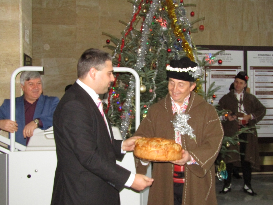Да е здрава, да има берекет и късмет, наричаха за стопаните в Областна администрация Добрич добри гости коледари от професионален фолклорен ансамбъл „Добруджа“. По традиция и тази година те гостуваха в администрацията и благословиха домакина Областния управител Красимир Кирилов. Той дари коледарите с дъхав кравай и помоли да благословят хляба на Добруджа и всичките жители на областта. Дружината нарече за благополучие и щастие във всеки дом, а домакините ги дариха щедро.