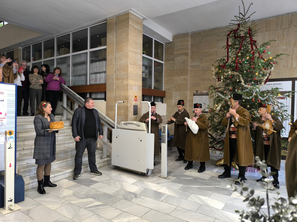 Коледари от ПФА „Добруджа“ с главен художествен ръководител Стоян Господинов днес – 23.12.2025 г., гостува в сградата на Областна администрация Добрич. Добрите гости бяха посрещнати с погача от стопаните – областният управител Живко Желязков и директорът на Областна дирекция „Земеделие“ инж. Десислава Иванова. Коледарите пяха и наричаха за здраве и берекет както за екипите на двете администрации, така и за жителите на цялата област Добрич.