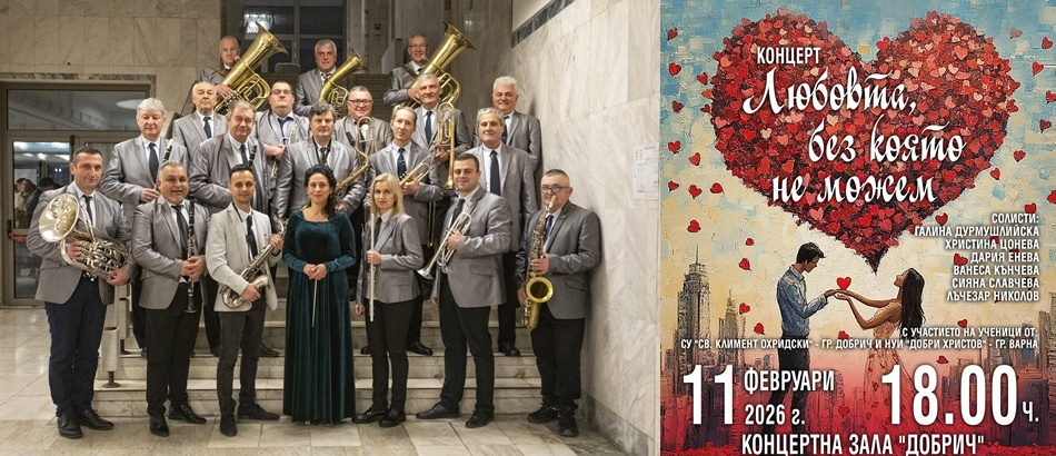 На 11 февруари от 18:00 часа в Концертна зала „Добрич“ ще се проведе концерт под надслов „Любовта, без която не можем“, посветен на предстоящия празник на влюбените, съобщават от Общински културен институт - Добрич.