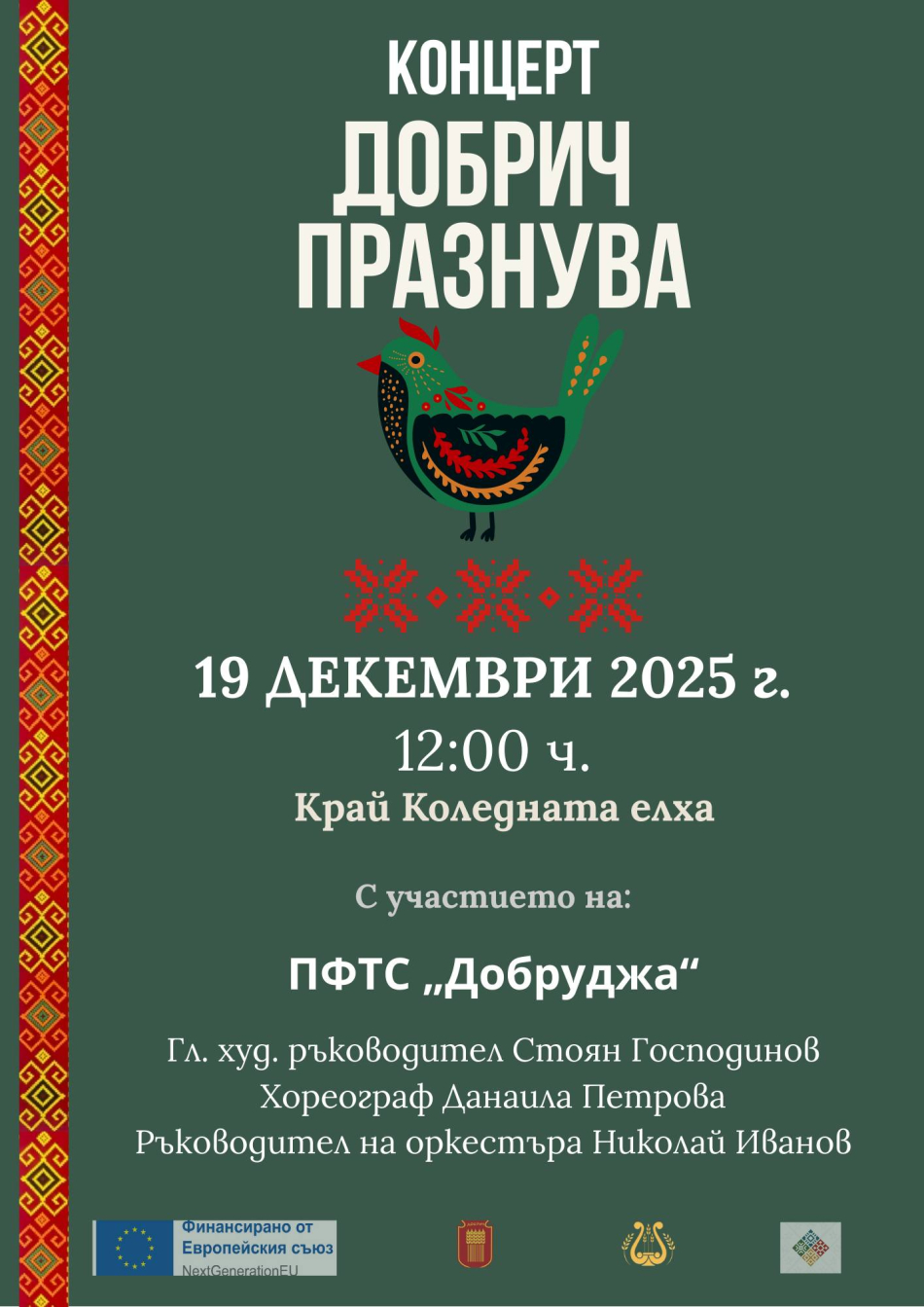 Днес от 12:00 ч. в край коледната елха в центъра на Добрич ще се състои концерт „Добрич празнува“ с участието на Представителна фолклорна танцова студия „Добруджа“ с главен художествен ръководител Стоян Господинов и хореограф Данаила Петрова.