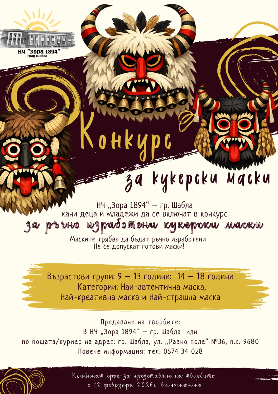 Конкурс за ръчно изработени кукерски маски от деца и младежи обяви Народно читалище „Зора 1894“ в Шабла. Конкурсът има за цел да запознае децата и учениците с богатството на българските традиционни обичаи и обреди, да представи и популяризира уникалната символика на кукерските маски и да насърчи интереса към съхраняването на живото културно наследство на България.