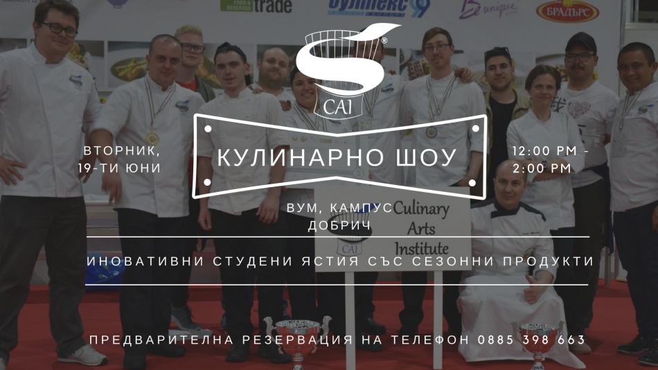 На 19 юни от 12.00 часа във Висшето училище по мениджмънт ще се проведе кулинарна демонстрация, водена от победителите на „Национална кулинарна купа 2018 г.“, която се проведе през април в Пловдив. Шеф Васил Якимов, класиран на първо място в секция „най-добър готвач на България“ и шеф Калоян Колев, класиран заедно със своя отбор на 2-ро място в секция „най-добър кулинарен отбор“ ще готвят иновативни студени ястия със сезонни продукти. Кулинарното шоу ще бъде в сградата на Висше училище по мениджмънт (ВУМ - преобразуваният Международен колеж) и ще започне в зала 216, а след това продължи с демонстрация на новата учебна база за специалностите по кулинарни изкуства.