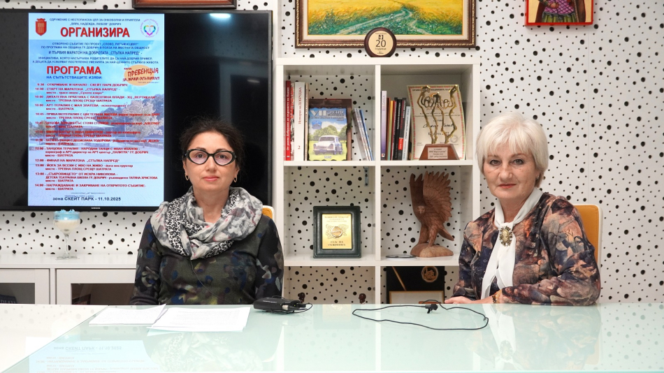 Събитие по проект „Слово, ритъм и цвят“, финансиран по програма на Община Добрич в полза на местната общност организира Сдружение за онкоболни и приятели „Вяра, Надежда, Любов“ гр. Добрич. То ще се проведе на 11 октомври на скейт площадката в градски парк „Св. Георги“ и част от програмата на събитието е и първия маратон на добротата под наслов „Стъпка напред“, каза Димитрина Илиева - председател на сдружение за онкоболни и приятели „Вяра, Надежда, Любов“. Тя гостува в студиото на медийна група „Добруджа“ заедно с Мая Златева – психотерапевт и доброволец към сдружението.