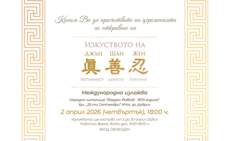Международната изложба „Изкуството на Джън Шан Жен“ ще бъде открита на 2 април 2026 г. от 18:00 часа в Народно читалище „Йордан Йовков – 1870 г.“ в Добрич.