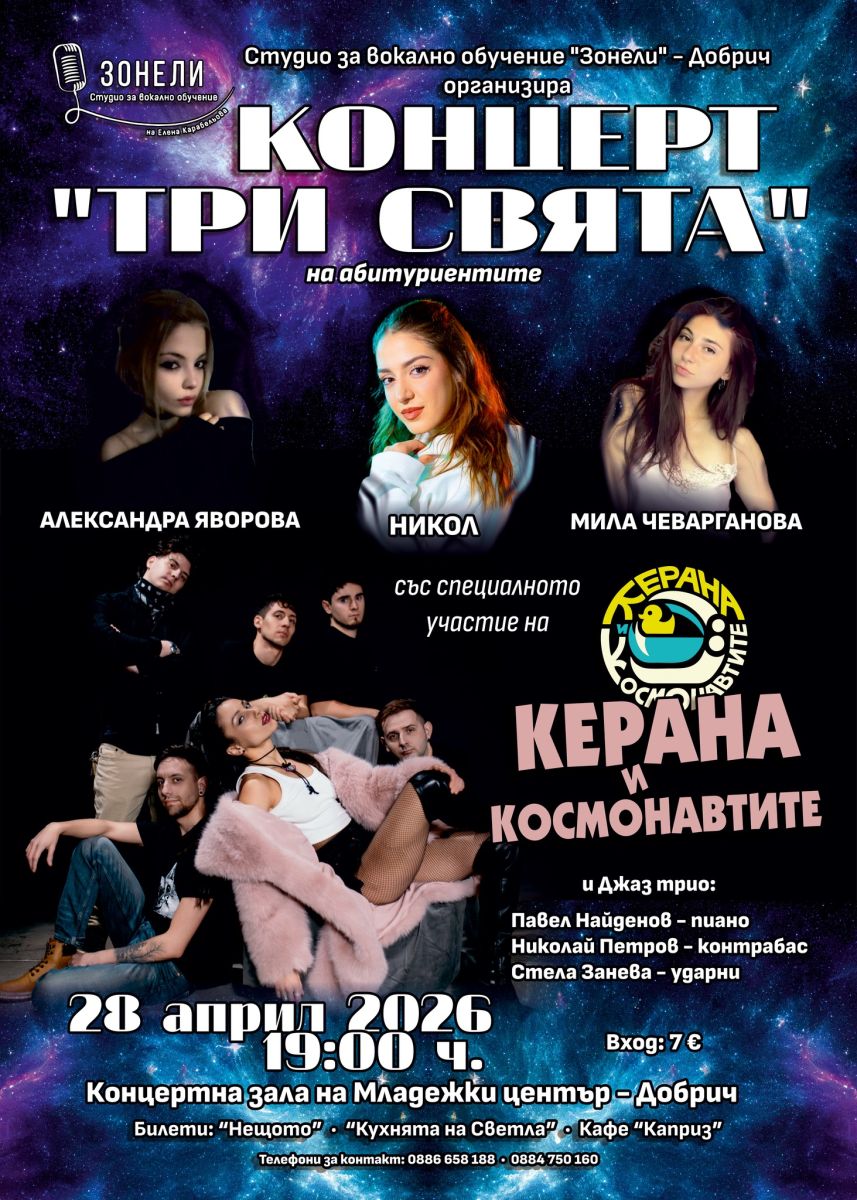 На 28 април от 19.00 часа в Младежки център – Добрич, ще се състои традиционният концерт на абитуриентите от Студио „Зонели“. Концертът носи заглавие ,,Три свята“ защото представя три зрелостнички от Студио за вокално обучение „Зонели“ - Александра Яворова, Никол Николова и Мила Чеварганова. Трите певици са заедно още от първи клас и сега под наставленията на вокалния си педагог Елена Карабельова ще излязат на сцена.