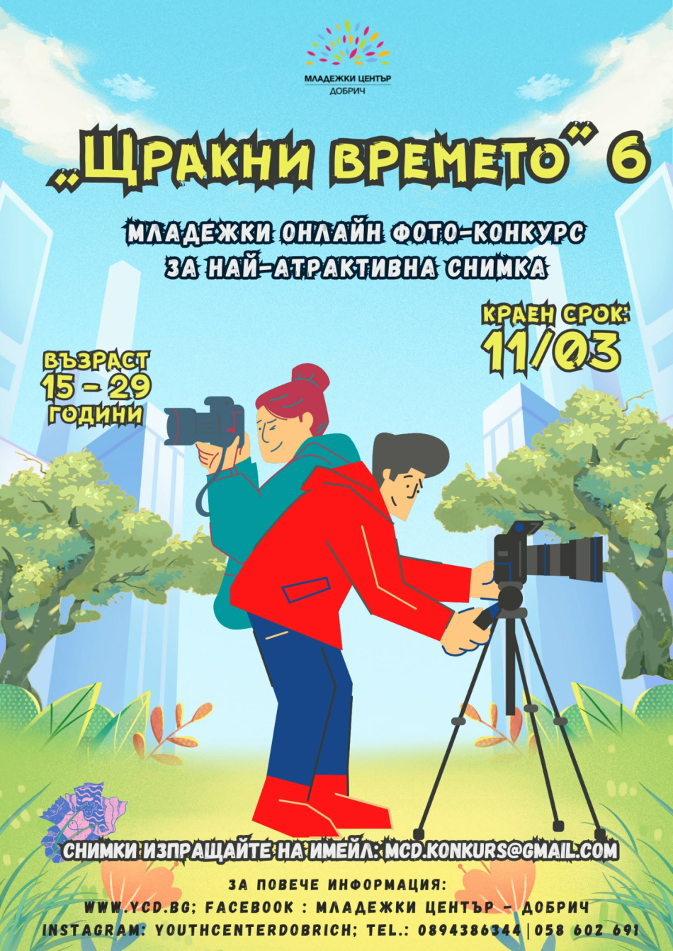 Младежки център – Добрич обяви старта на шестото издание на фотоконкурс „Щракни времето“, насочен към млади хора на възраст между 15 и 29 години от цялата страна. Инициативата цели участниците да уловят в един фотографски кадър красотата на времето – както в неговото метеорологично състояние, така и чрез впечатляващи сцени от заобикалящия ни свят.