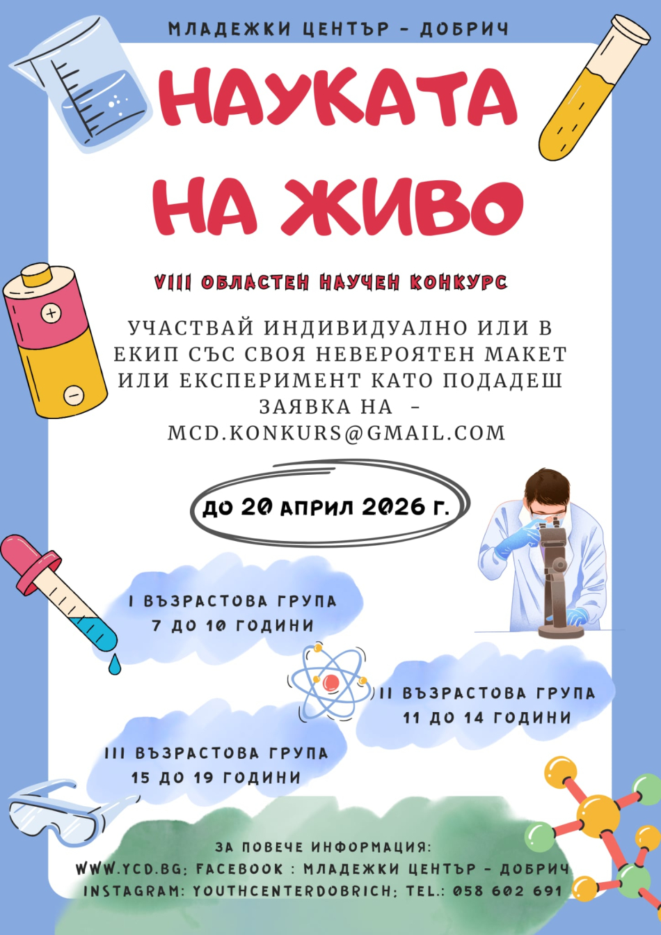 Младежки център – Добрич организира осмото издание на областния научен конкурс „Науката на живо“. Конкурсът за научни проекти е създаден по инициатива на Консултативния съвет към Младежки център – Добрич и има за цел да насърчи интереса на децата и младите хора към науката и образованието.