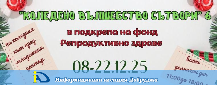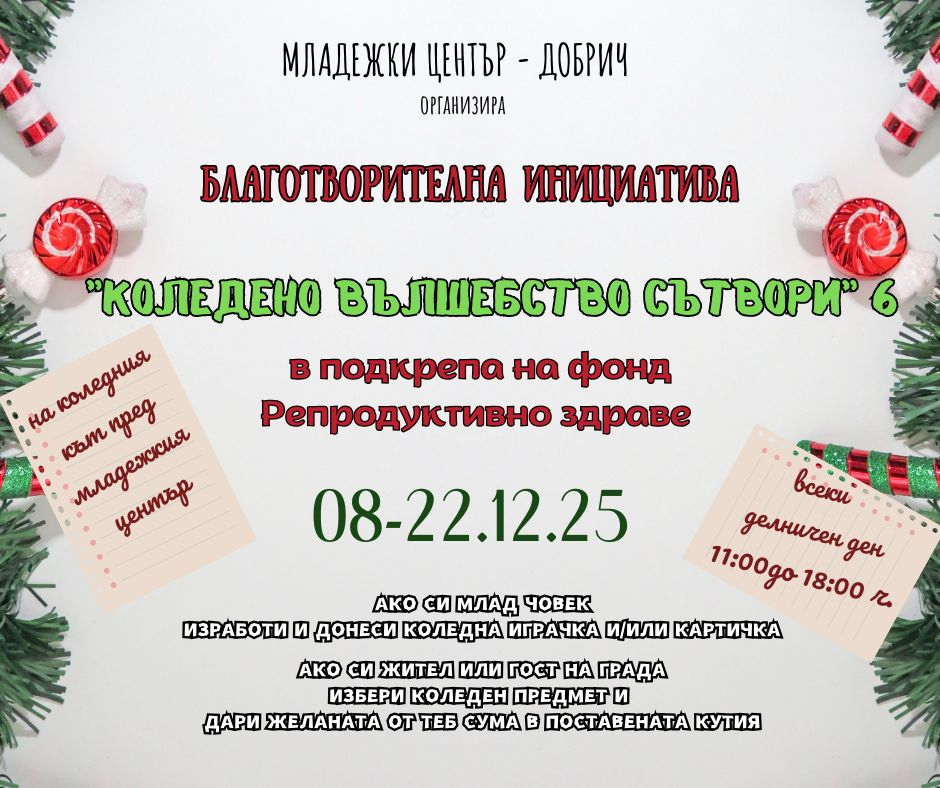 Младежки център – Добрич за шеста поредна година кани жителите и гостите на града да се включат в благотворителната инициатива „Коледно вълшебство сътвори“. И тази година кампанията подкрепя семейства с репродуктивни затруднения чрез Фонд „Репродуктивно здраве“.