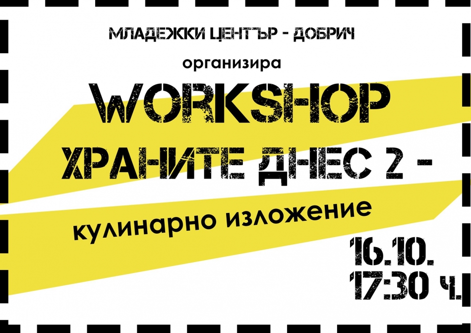 Днес от 17:30ч. в Младежки център – Добрич ще се проведе второ издание на уъркшопа “Храните днес" по случай 16 октомври - Международен ден на храната. На първото събитие участниците споделиха здравословните хранителни продукти, които използват в ежедневието си. В рамките на уъркшоп “Храните днес 2“, участниците предварително ще приготвят любимите си здравословни храни и напитки (дребни соленки и сладки), които ще представят в кулинарно изложение, ще споделят използваните продукти, ще обменят опит, рецепти и полезни съвети в областта на здравословното хранене.