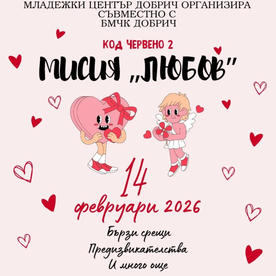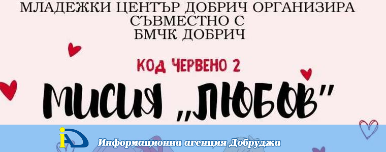 Младежки център – Добрич организира второто издание на инициативата „Код червено – Мисия любов“ по повод Свети Валентин, съвместно с Българския младежки Червен кръст – Добрич. Събитието ще се проведе на 14 февруари от 11:00 часа в зала 12 на сградата на центъра и се очаква да продължи до късния следобед.