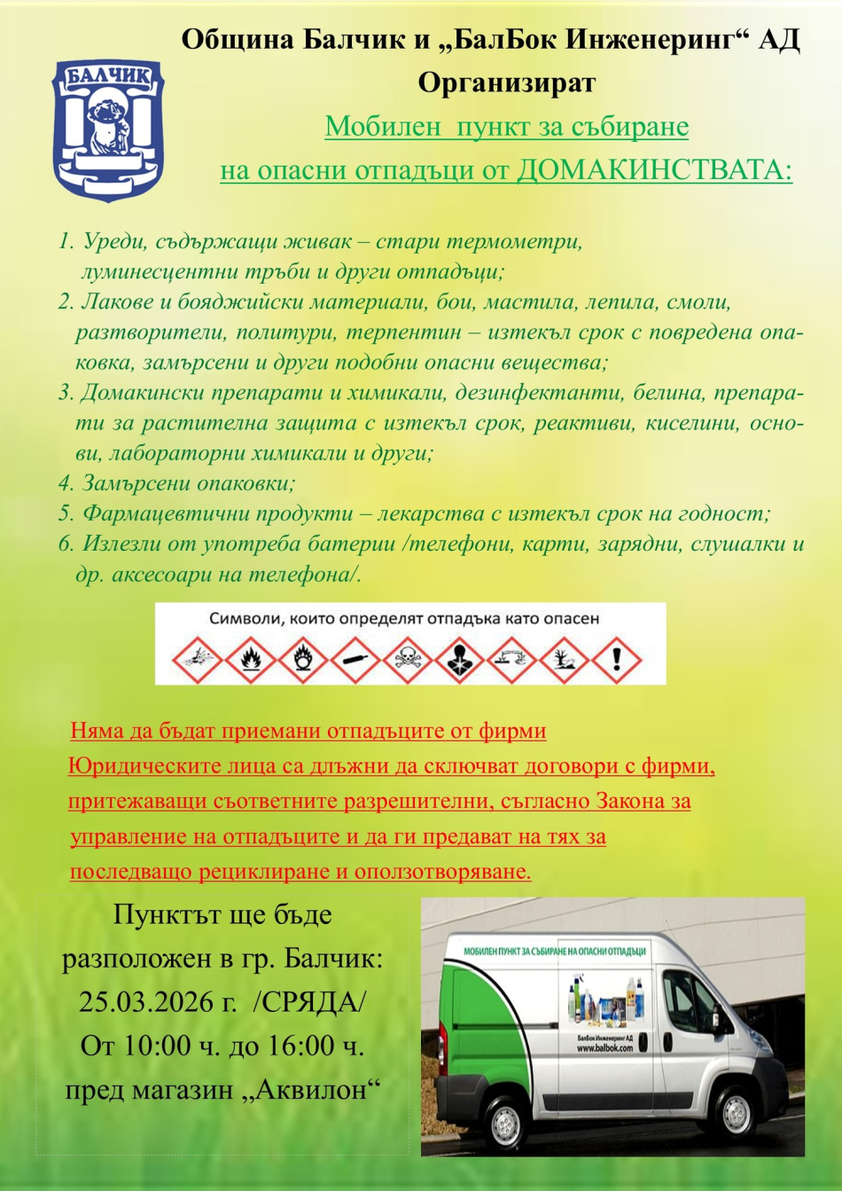 Община Балчик организира мобилен пункт за събиране на опасни отпадъци от домакинствата съвместно с „БалБок Инженеринг“ АД.