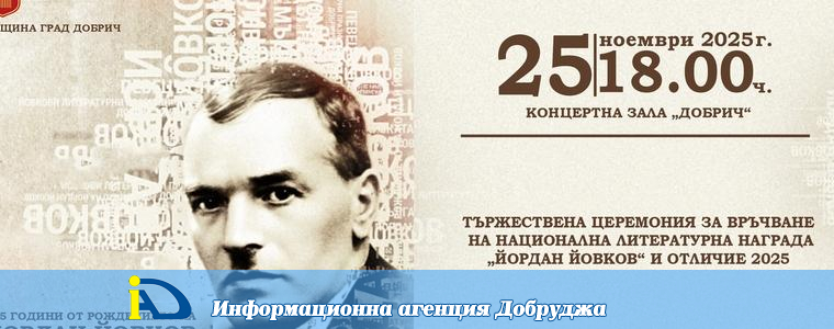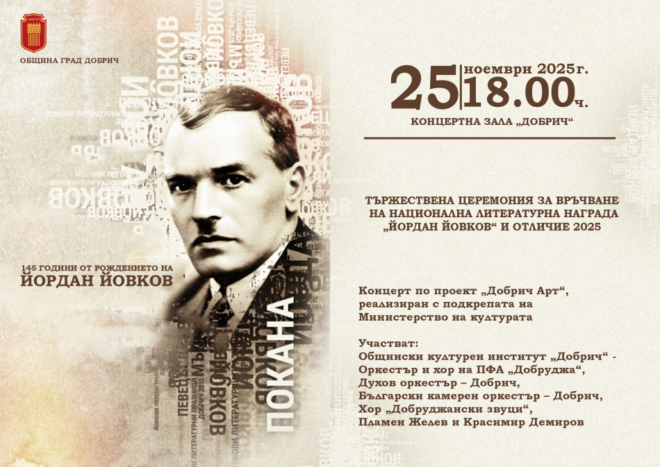 Община град Добрич ще връчи Националната литературна награда и отличие „Йордан Йовков” на 25 ноември от 18.00 часа. Церемонията ще се проведе е Концертна зала „ Добрич”. В рамките на събитието ще се проведе концерт по проект „Добрич арт” реализиран с подкрепата на Министерство на културата. Участие в него ще вземат Общински културен институт Добрич, Оркестър и хор на ПФА „Добруджа”, Духов оркестър „Добрич”, Български камерен оркестър – Добрич, Хор „Добруджански звуци”, Пламен Желев и Красимир Демиров.