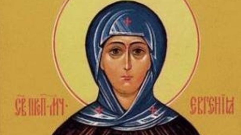 Света Евгения била римлянка, дъщеря на знатни родители - езичници. Баща й Филип бил управител на град Александрия и целия Египет. Тя се отличавала с бляскаво образование и красота. Девойката обаче се увлякла по християнството, напуснала родната къща и преоблечена като мъж, отишла в един мъжки манастир, където била покръстена, станала монах и след смъртта на игумена била единодушно избрана на негово място. Придобила голяма известност, изцерявайки бедните чрез молитва. Така приковала вниманието на една зла жена - Мелантия, която тя излекувала. Мелантия пожелала да прелъсти Евгения, защото я смятала за мъж. Като не успяла, тя я наклеветила, че уж преоблечената като мъж жена се опитала да я прелъсти.