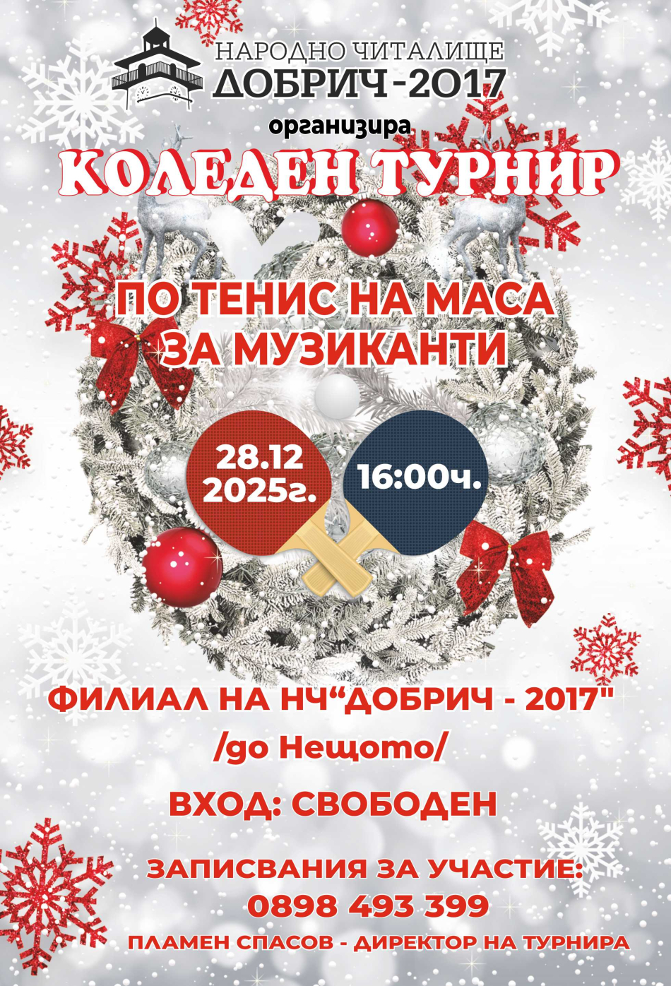 Народно читалище „Добрич-2017“ организира първия по рода си турнир по тенис на маса, насочен специално към музиканти. Събитието ще се проведе утре, 28 декември, във филиала на читалището на ул. „Независимост“ №2, в близост до „Нещото“.
