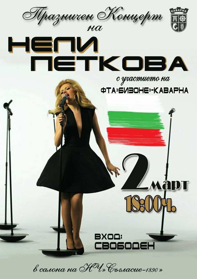 На 2 март Община Каварна кани жителите и гостите на града на празничен концерт по случай националния празник на България 3-ти март. Концертът ще се проведе в залата на Народно читалище “Съгласие-1980“ от 18 часа. В него ще вземат участие известната със завладяващите си изпълнения на български патриотични песни Нели Петкова и каварненския танцов ансамбъл“БИЗОНЕ“. Входът е свободен.