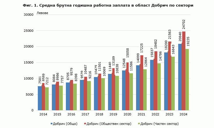 Област Добрич заема 18-о място сред всички области в страната по размер на средната брутна годишна работна заплата за 2024 година, показват данни на статистиката. Средното възнаграждение в региона възлиза на 20 840 лева, при 27 898 лева средно за страната.