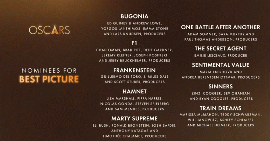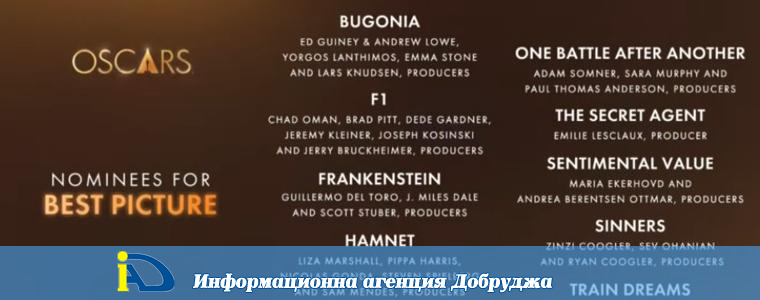 Освен „Грешници“, за най-добър филм са номинирани: „Бугония", „F1: Филмът", „Франкенщайн", „Хамнет", „Върховният Марти", „Битка след битка", „Тайният агент", „Сантиментална стойност" и Train Dream.