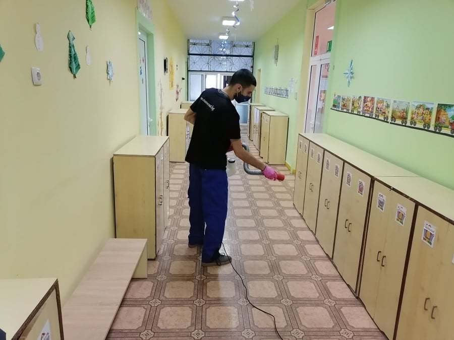 В сградите на детските заведения се обработват активните повърхности. Такива са входните врати и фоайета, парапети на стълби, места за сядане, общи тоалетни, а в занималните – дръжки на врати, масички, дидактични шкафове. Това се прави за осигуряване на безопасността на децата и персонала.