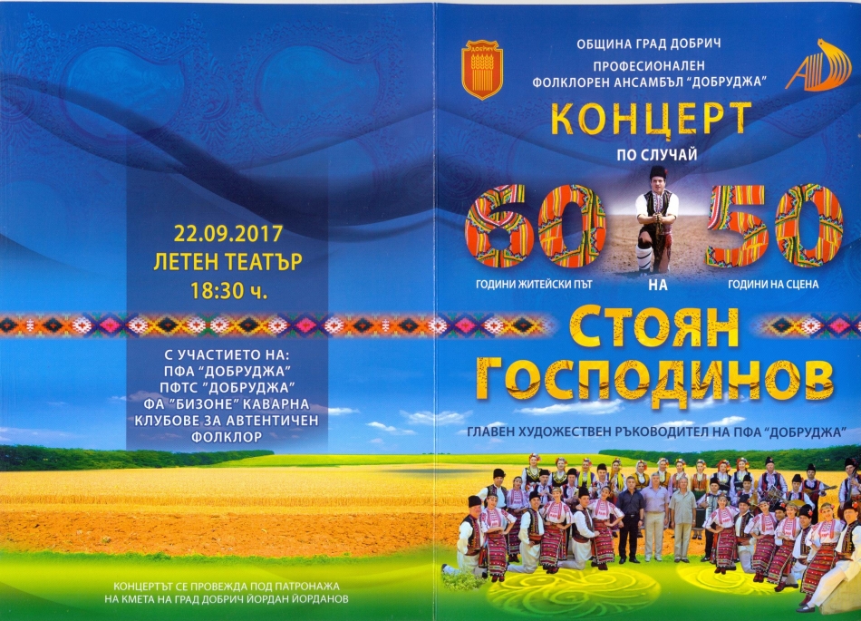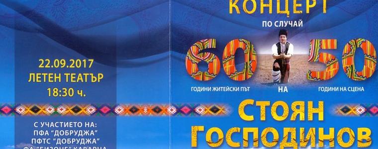 Концерт по случай 60 години житейски път и 50 години на сцена на главния художествен ръководител на ПФА „Добруджа“ Стоян Господинов ще се състои на 22 септември от 18.30 часа в Летния театър. Той се организира от Община Добрич и Ансамбъла и е под патронажа на кмета Йордан Йорданов. На сцената ще се представят ПФА „Добруджа“, ПФТС „Добруджа“, ФА „Бизоне“ Каварна и Клубовете за автентичен фолклор „Добруджа“ и „Жътвари“. Ще бъдат изпълнени фолклорни танци и песни от всички етнографски области на България. За всички почитатели на българския фолклор са предвидени и изпълнения на гости от град Токио‚ Япония, които облечени в български народни носии ще зарадват зрителите с български танци, изпълнени съвместно с ПФА „Добруджа“.