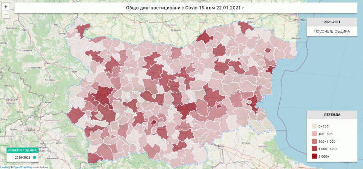 Очаквано, диагностицираните са съсредоточени в големите общини – от една страна, в тях е по-голямата част от населението, от друга гъстотата му е по-висока, което улеснява разпространението на вируса. Най-много – над ¼ от всички диагностицирани, са в столицата София (56,9 хиляди). Малките общини като цяло са и с по-малко случаи, но при тях трябва да се има предвид и по-трудният достъп до тестове.