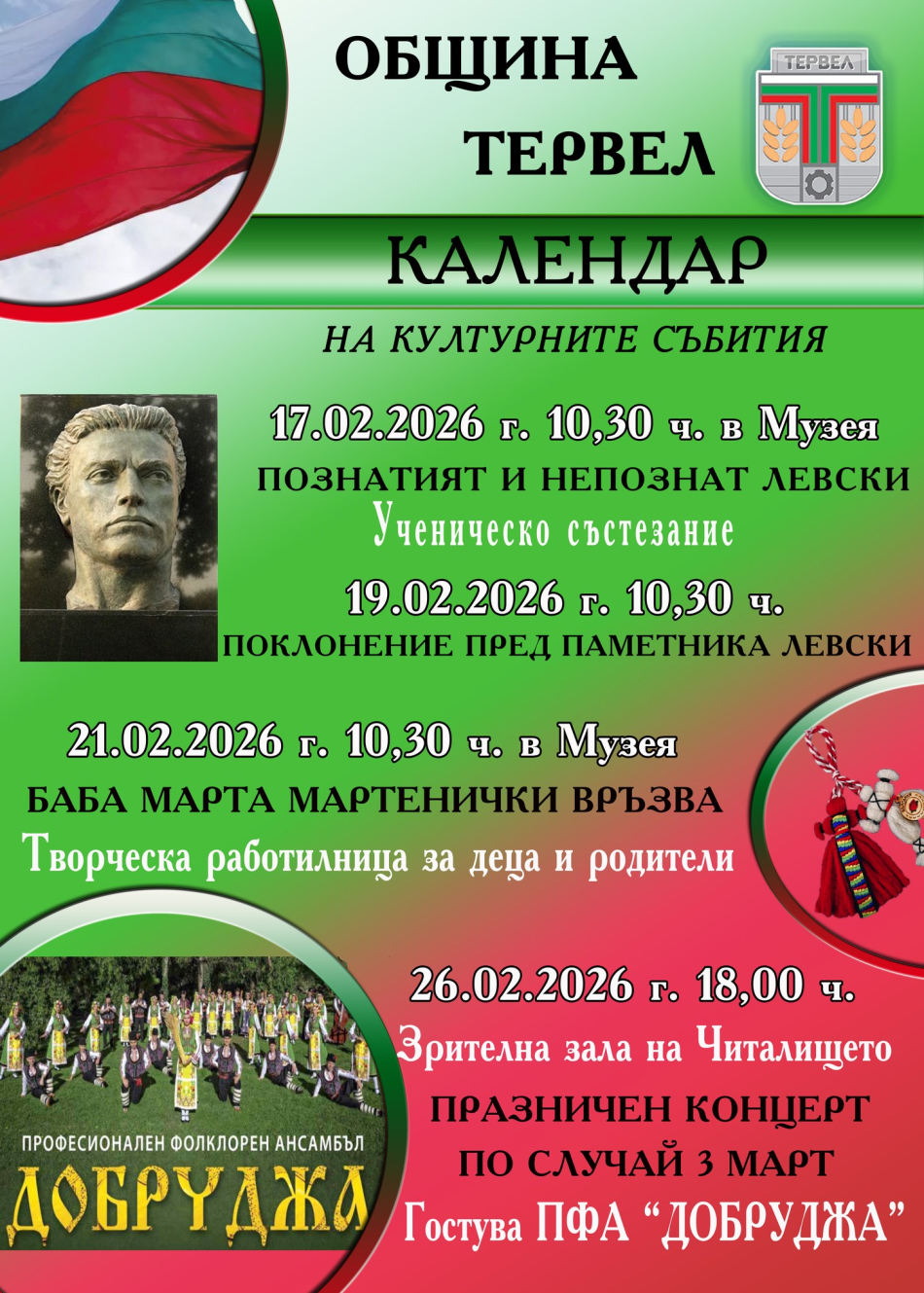 Община Тервел представи културния си календар за месец февруари 2026 година, който включва поредица от събития, посветени на националната памет, традициите и българската култура.