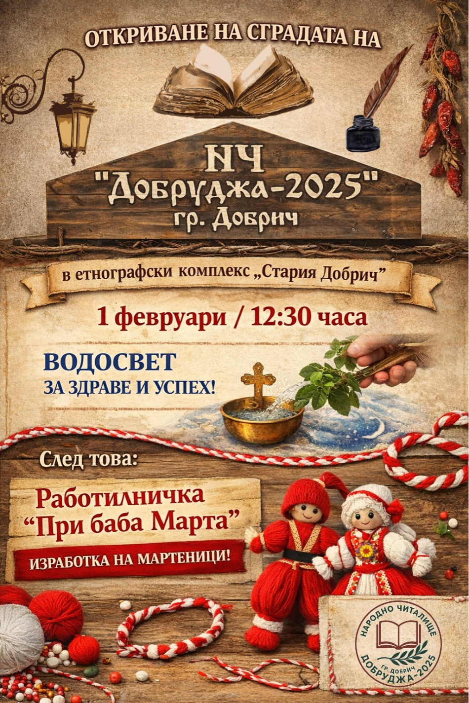 Програмата за откриването на новата сграда на читалище „Добруджа-2025“ включва водосвет за здраве и успех, след което ще се проведе работилничка „При Баба Марта“ – за изработка на мартеници.