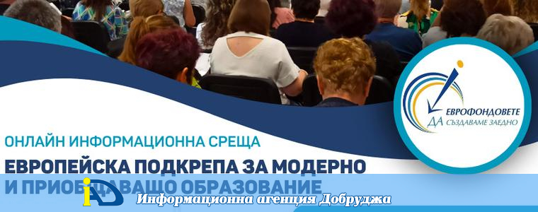 Областен информационен център – Добрич (ОИЦ – Добрич) организира онлайн информационно събитие на тема „Европейска подкрепа за модерно и приобщаващо образование“. Целта на срещата е да бъдат представени възможностите за финансиране с европейски средства достъпни за училища, образователни организации, неправителствени организации, читалища, общини и други.