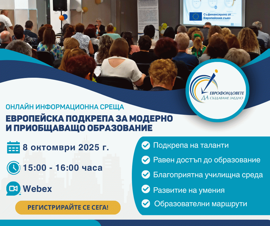 Експертите от ОИЦ-Добрич ще представят актуалните възможности за финансиране с европейски средства по Програма „Образование" 2021-2027 г. Ще бъдат разгледани отворените и предстоящите процедури за финансиране на проекти в областта на подкрепа на таланти, осигуряване на равен достъп до образование, създаване на благоприятна училищна среда и развитие на умения и образователни маршрути.
