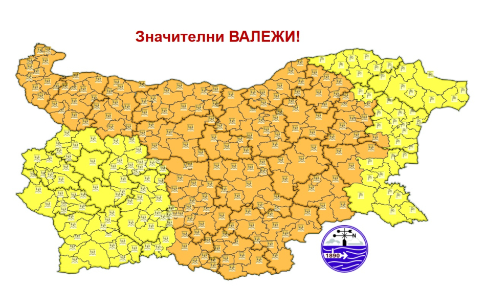 Обявен е оранжев код в 20 области на Северна, Централна и Източна България за интензивни валежи от дъжд и мокър сняг в северните и централните части на страната, и дъжд, и силен вятър в източните части.