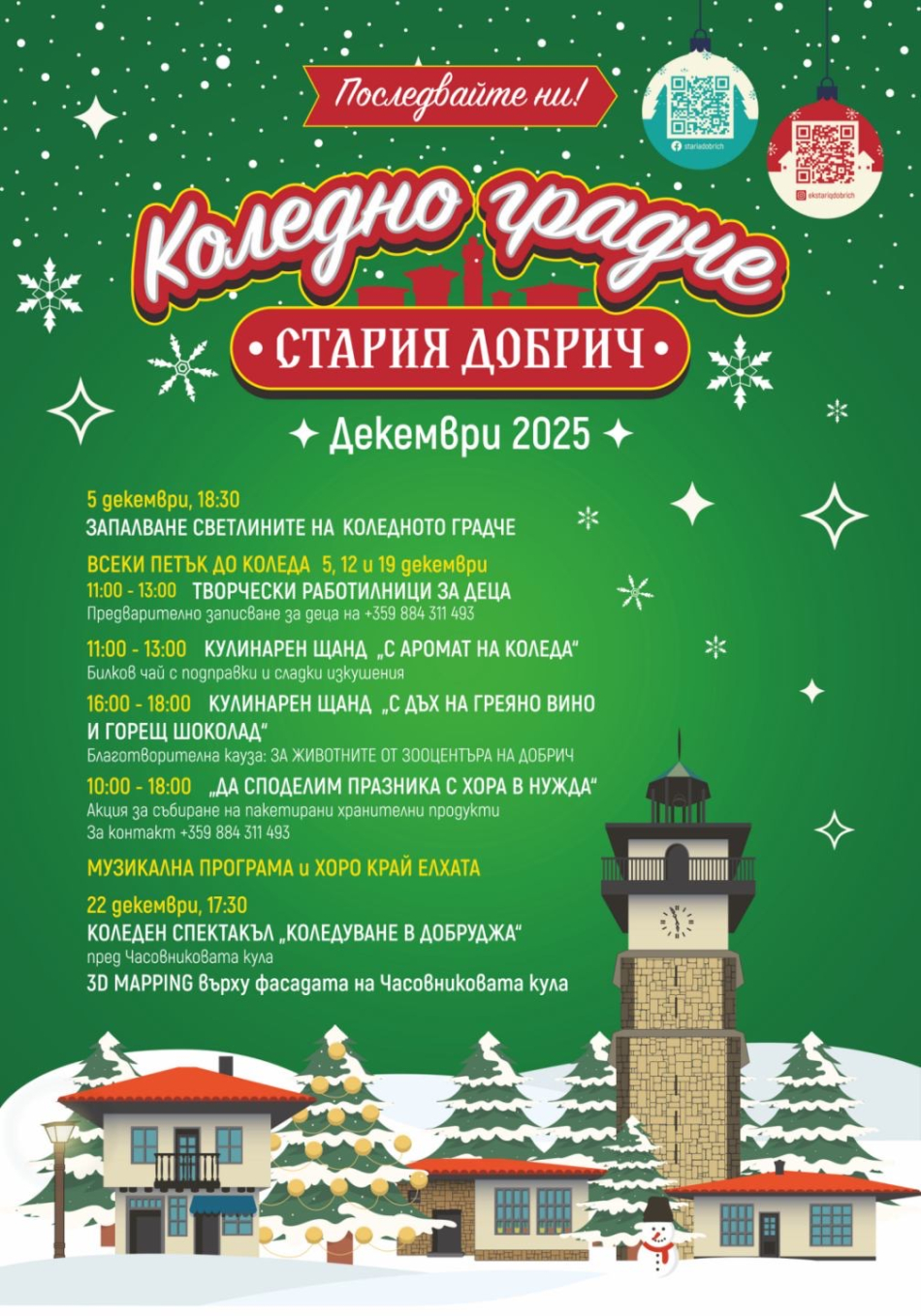 От днес „Стария Добрич“ се превръща в коледно градче. В етнографския комплекс е поставено и коледно дърво, което вече е украсено и тази вечер ще бъде официално светнато. Инициативата е на Регионален исторически музей-Добрич, като всеки петък до Коледа (5, 12 и 19 декември) жителите и гостите на Добрич ще могат да се потопят в празничната атмосфера чрез разнообразна програма и възможност за участие в благотворителни каузи. Първата от тях е насочена към събиране на средства за храна за нуждите на зооцентъра.