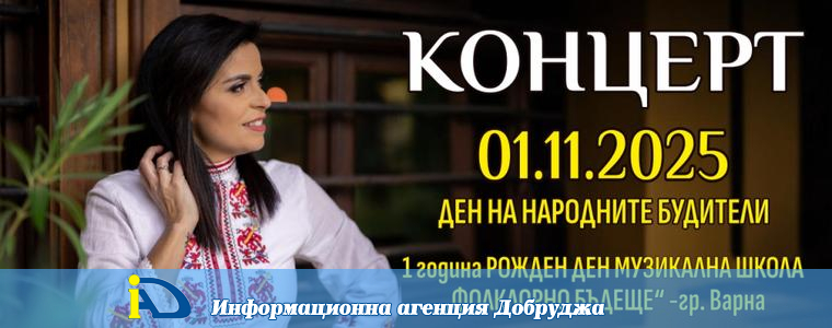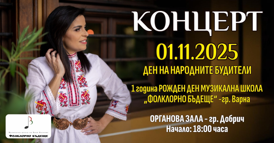 Празничен концерт, посветен на Деня на народните будители, с който ще бъде отбелязан и първият рожден ден на Музикална школа „Фолклорно бъдеще“, ще се проведе тази вечер от 18:00 часа в зала „Добрич“.