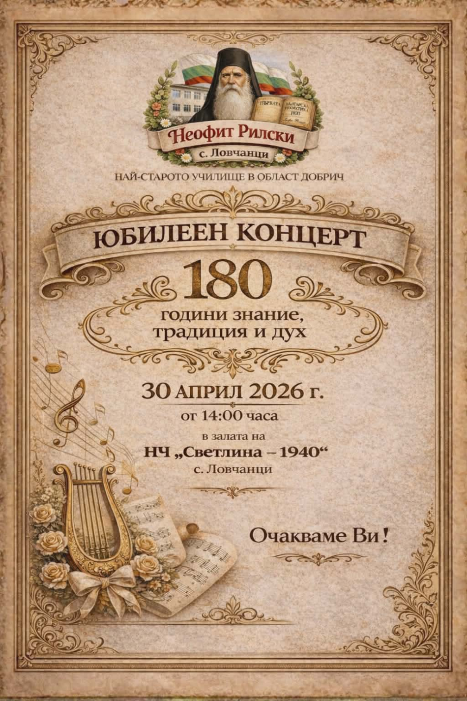 Най-старото училище в област Добрич – ОУ „Неофит Рилски“ в село Ловчанци, ще отбележи 180 години от създаването си с тържествен концерт. Събитието, под наслов „180 години – знание, традиция, дух“, ще се проведе утре (30 април) от 14:00 часа в залата на НЧ „Светлина – 1940“ в селото.