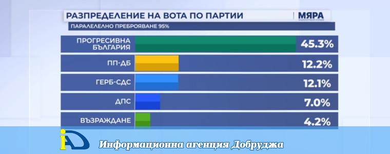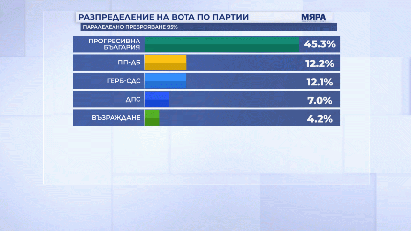 Пет политически формации ще намерят място в новото Народно събрание според данните от 95% паралелно преброяване на социологическа агенция „Мяра“. Под 4-процентната бариера остава „БСП – Обединена левица“.