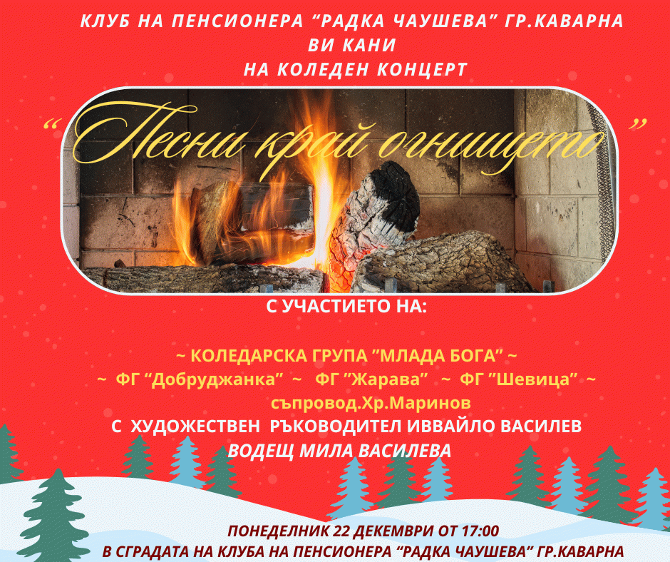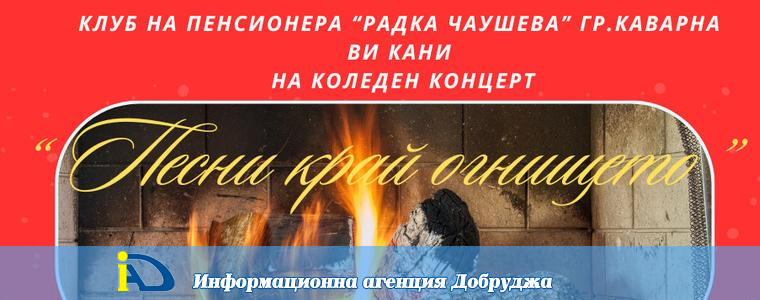 Пенсионерски клуб „Радка Чаушева“ в Каварна организира днес от 17:00 часа празничния концерт „Песни край огнището“, посветен на коледните традиции и българския фолклор.