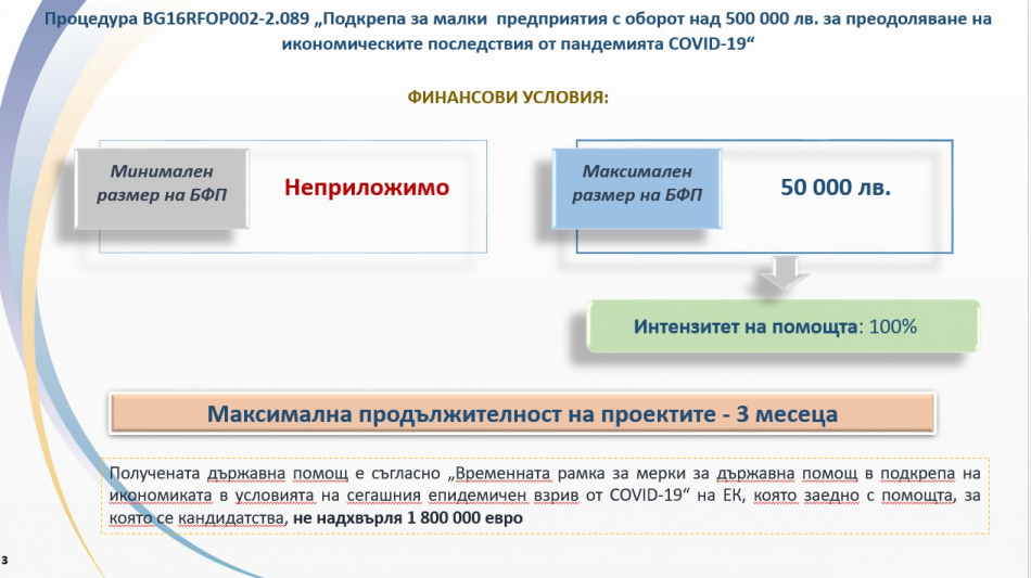 С бюджет от 78 233 200 лв. ще бъде осигурен оперативен капитал за малките предприятия, реализирали оборот над 500 000 лв., за справяне с последиците от пандемията COVID-19. Безвъзмездната финансова помощ е фиксирана и е в размер на 50 000 лв. на проект за покриване на текущите оперативни разходи на одобрения кандидат. Предоставяната по процедурата безвъзмездна финансова помощ е под формата на преки, безвъзмездни средства съгласно раздел 3.1 от „Временна рамка за мерки за държавна помощ в подкрепа на икономиката в условията на сегашния епидемичен взрив от COVID-19“ от 19.03.2020 г.