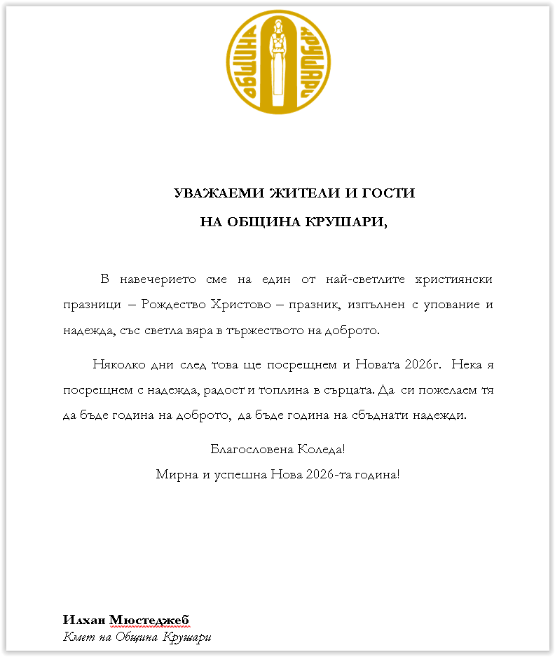 Празнично пожелание от кмета на община Крушари – Илхан Мюстеджеб