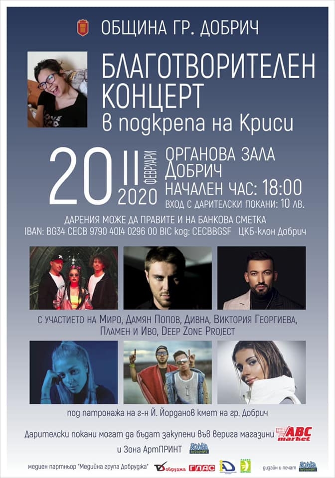 Благотворителен концерт в подкрепа на Криси, ще се състои на 20 февруари от 18.00 часа в зала “Добрич”. Събитието, което се организира под патронажа на кмета на Добрич Йордан Йорданов, има за цел набиране на средства за 20-годишната Кристина от Добрич, която страда от от рядко и тежко генетично заболяване и след навършване на пълнолетие няма право на помощ при набавяне на жизнено необходимата й специализирана храна.