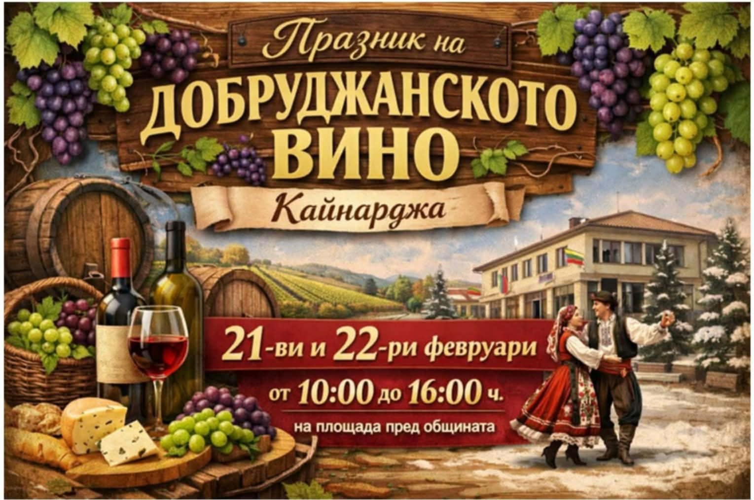 Празник на добруджанското вино се провежда днес и утре на площада в с. Кайнарджа, област Силистра. Атрактивната проява се организира от Община Кайнарджа, с партньорството на НЧ „Отец Паисий -1942”, с. Кайнарджа и сдружение „Общности, традиции, култура“.